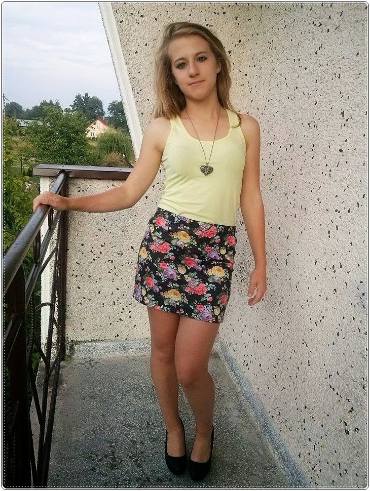 Na niedziele postawiłam na prostotę, strój średnio wygodny bo wiadomo jak sprawa wygląda gdy się nosi spódniczki mini :P Jest to jednak jedna z moich ulubionych miniówek którą upolowałam kiedyś w Atmospherze, do tego obcisły żółty top z New Yorkera oraz obcasy zakupione specjalnie z myślą o bierzmowaniu i zakończeniu roku szkolnego :) Mimo tego że są dość wysokie są całkiem wygodne choć jak wiadomo przy dłuższym noszeniu po ściągnięciu czuję się ogromną ulgę dla stóp :D Dla dopełnienia całego outfitu założyłam jeszcze naszyjnik który dostałam kiedyś w prezencie :P